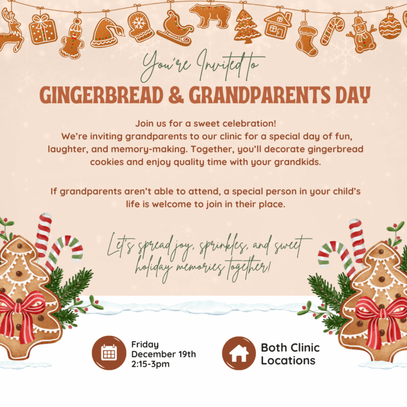 We’re inviting grandparents to our clinic for a special day of fun, laughter, and memory-making. Together, you’ll decorate gingerbread cookies and enjoy quality time with your grandkids. If grandparents are not able to attend, a special person in your child’s life is welcome to join in their place.